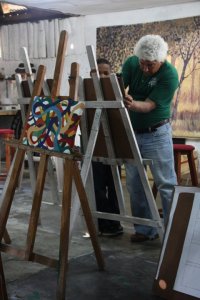 Here Fran is instructing a young boy at the art school. My painting is in the foreground.